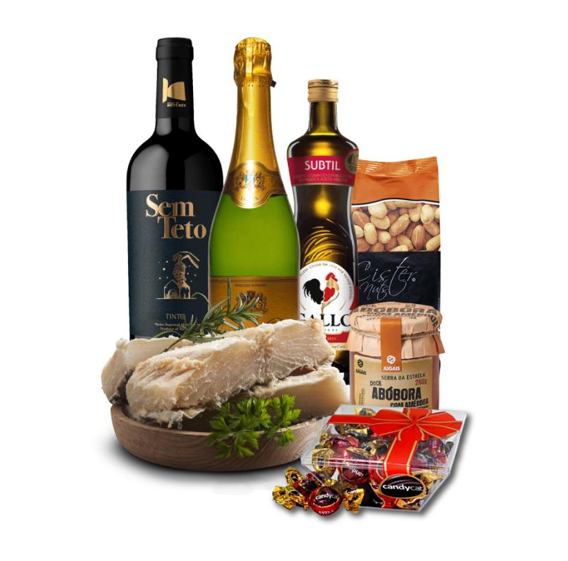 Cabaz Tradicional 2025, composto por vinho, espumante, compota, amendoim, bombons, azeite e bacalhau. Encomenda única de cabazes.